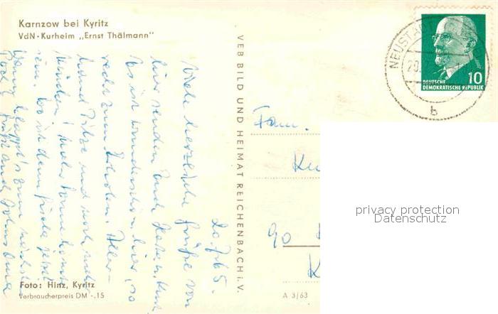 72690836 alte Postkarte Karnzow bei Kyritz VdN-Kurheim Ernst Thaelmann postalisch gelaufen Erhaltung siehe scans [LiesaD40] KatCode: 11110012068264