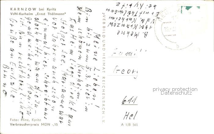 71990909 alte Postkarte Karnzow VdN-Kurheim Ernst Thaelmann postalisch gelaufen KatCode: 11110012068264