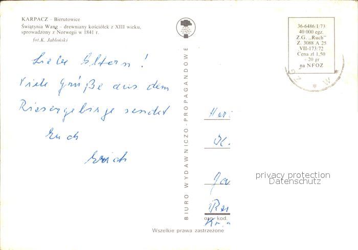 old postcard Karpacz Bierutowice Swiatynia Wang drewniany kosciolek z XIII wicku sprowadzony z Norwegii postalisch gelaufen Erhaltung siehe scans