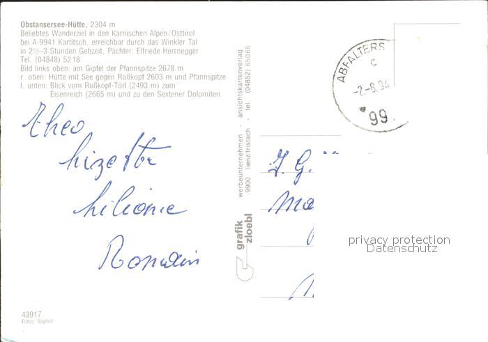 72235084 alte Postkarte Kartitsch Obstansersee- Huette postalisch gelaufen Erhaltung siehe scans KatCode: 11390333070713