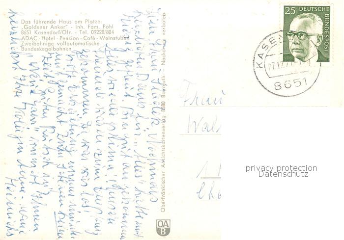 73866483 alte Postkarte Kasendorf Oberfranken Hotel Pension Goldener Anker Gastraeume Kegelbahn postalisch gelaufen Erhaltung siehe scans [WerneD78] KatCode: 11110009477124
