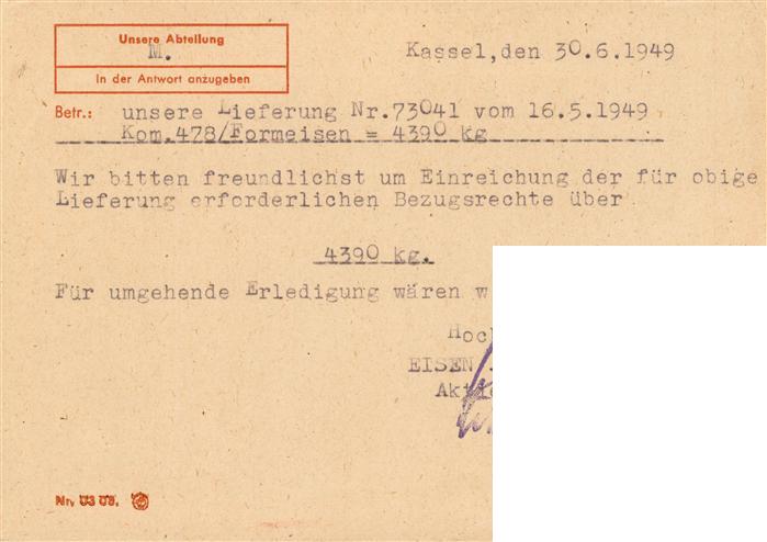 73909520 KAssEL CITY Eisen und Stahlhandel AG Materialanforderung postalisch gelaufen Erhaltung siehe scans [WerneD78] alte Postkarte Wern Katcode 11110006611000