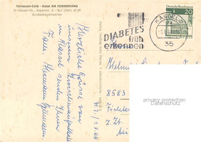 73649238 KAssEL CITY Hotel Am Sonnenhang Terrassen Cafe Restaurant Kegelbahn postalisch gelaufen Erhaltung siehe scans [FriedD77] alte Postkarte Frie Katcode 11110006611000