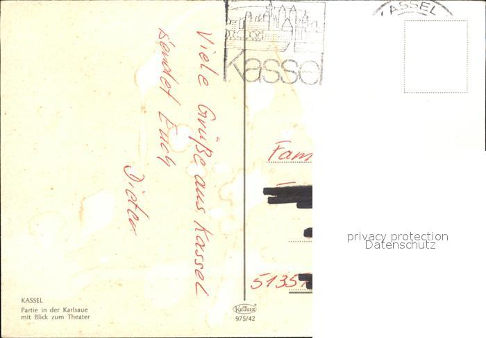 72412429 alte Postkarte KAssEL CITY Partie in der Karlsaue Blick zum Theater postalisch gelaufen Erhaltung siehe scans KatCode: 11110006611000