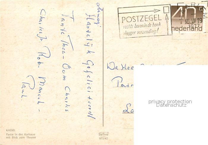 72935701 alte Postkarte KAssEL CITY Partie in der Karlsaue mit Blick zum Theater postalisch gelaufen Erhaltung siehe scans [FriedD77] KatCode: 11110006611000