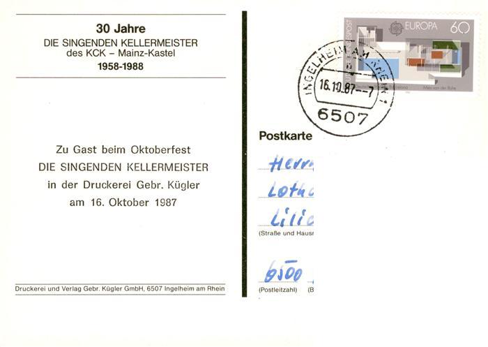 73924590 alte Postkarte Kastel Mainz Die Singenden Kellermeister des KCK 1958 bis 1988 postalisch gelaufen Erhaltung siehe scans [WerneD78] KatCode: 11110007315000