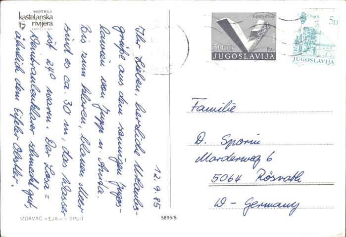 old postcard Kastela Hotel Kastelanska Rivijera Strand postalisch gelaufen Erhaltung siehe scans