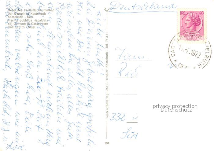 73339892 alte Postkarte Kastelruth Suedtirol Freibad Alpenpanorama postalisch gelaufen Erhaltung siehe scans [FriedD77] KatCode: 11390