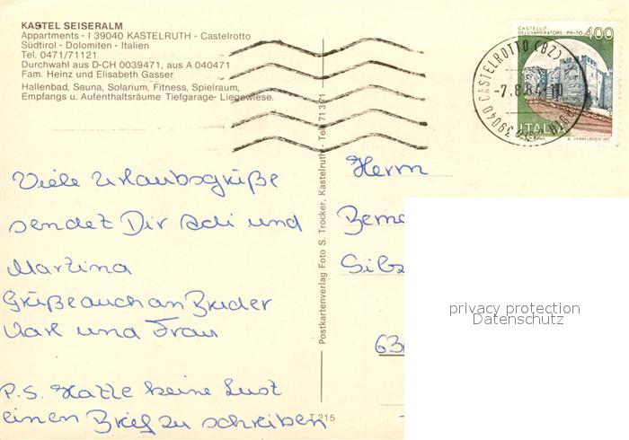 73211566 alte Postkarte Kastelruth Suedtirol Kastel Seiseralm Aparthotel postalisch gelaufen Erhaltung siehe scans [PaolaD17] KatCode: 11390