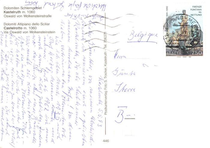 alte Postkarte Kastelruth Suedtirol Oswald von Wolkenstein-Strasse Ortszentrum Kirche Albergo Gasthof postalisch gelaufen Erhaltung siehe scans [FriedD77]