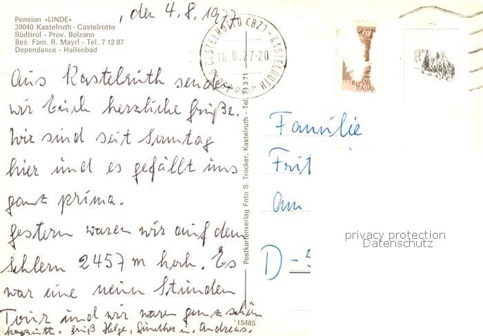 73304541 alte Postkarte Kastelruth Suedtirol Pension Linde Kirche Landschaftspanorama Dolomiten postalisch gelaufen Erhaltung siehe scans [FriedD77] KatCode: 11390