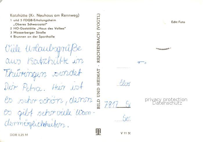 73100729 alte Postkarte Katzhuette FDGB Erholungsheim Oberes Schwarzatal HO Gaststaette Brunnen postalisch gelaufen Erhaltung siehe scans [KathaD81] KatCode: 11110016073037