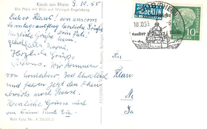 73948904 Kaub Caub Rhein Die Pfalz mit Blick auf Weingut Engelsburg postalisch gelaufen Erhaltung siehe scans [FriedD77] alte Postkarte Frie Katcode 11110007141069