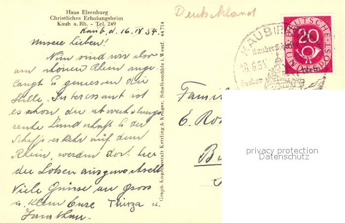43349634 alte Postkarte Kaub Christliches Erholungsheim Haus Elsenburg Weinberge Rheintal postalisch gelaufen Erhaltung siehe scans [FriedD77] KatCode: 11110007141069