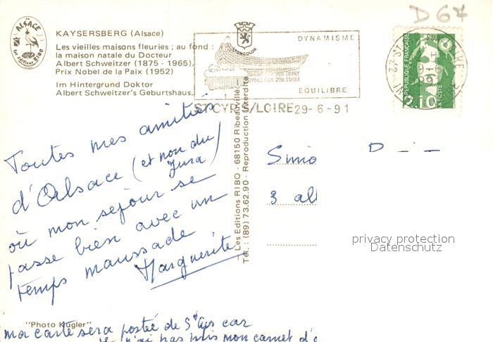 carte postale Kaysersberg Haut Rhin Maison natale du Docteur Albert Schweizer Prix Nobel de la Paix 1952 postalisch gelaufen Erhaltung siehe scans [LiesaD40]