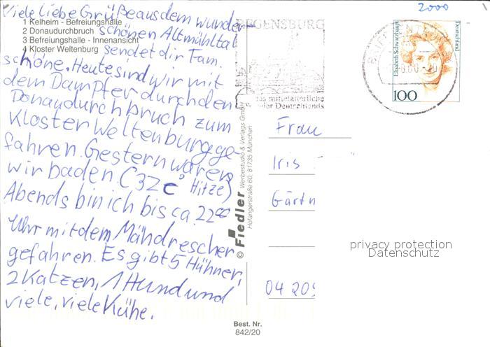 72522747 alte Postkarte Kelheim Befreiungshalle Donaudurchbruch Befreiungshalle Inneres Kloster Weltenburg postalisch gelaufen Erhaltung siehe scans KatCode: 11110009273137