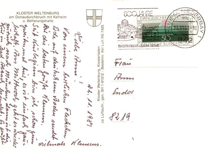 73945309 Kelheim Donau Kloster Weltenburg am Donaudurchbruch mit Befreiungshalle postalisch gelaufen Fliegeraufnahme Erhaltung siehe scans [WerneD78] Fliegeraufnahme alte Postkarte Wern Katcode 11110009273137
