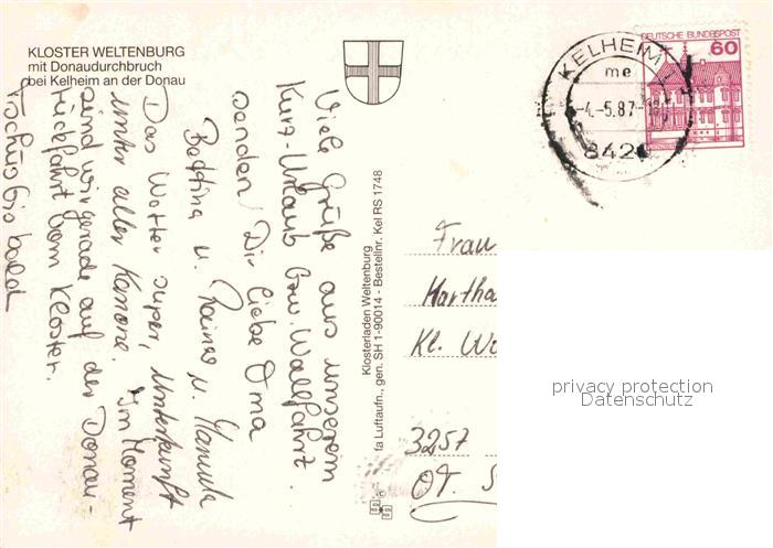 72740848 alte Postkarte Kelheim Fliegeraufnahme Kloster Weltenburg postalisch gelaufen Erhaltung siehe scans [LiesaD40] KatCode: 11110009273137