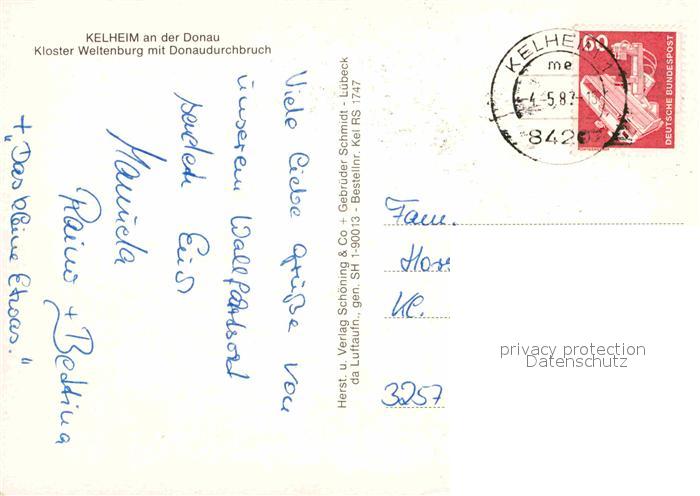 72719040 alte Postkarte Kelheim Fliegeraufnahme Kloster Weltenburg mit Donaudurchbruch postalisch gelaufen Erhaltung siehe scans [LiesaD40] KatCode: 11110009273137