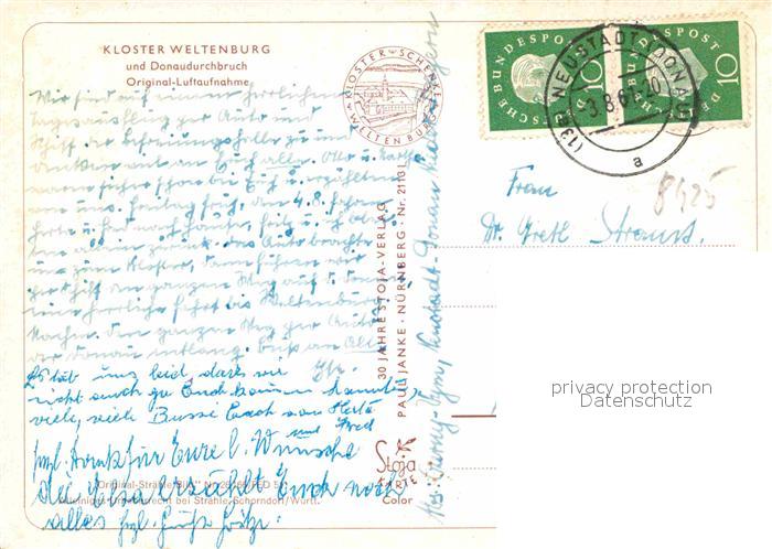 72839272 alte Postkarte Kelheim Kloster Weltenburg mit Donaudurchbruch Fliegeraufnahme postalisch gelaufen Erhaltung siehe scans [WerneD78] KatCode: 11110009273137