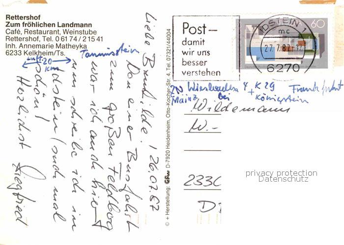 72839461 alte Postkarte Kelkheim Rettershof Zum froehlichen Landmann Cafe Restaurant Kinderspielplatz postalisch gelaufen Erhaltung siehe scans [FriedD77] KatCode: 11110006436008