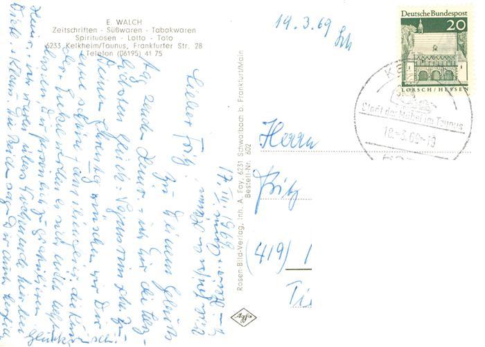 73878571 alte Postkarte Kelkheim Stadtpanorama Kirche Wohnsiedlung Hochhaeuser postalisch gelaufen Erhaltung siehe scans [FriedD77] KatCode: 11110006436008