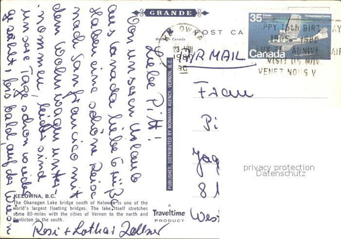old postcard Kelowna Fliegeraufnahme Okanagan Lake Bridge postalisch gelaufen Erhaltung siehe scans