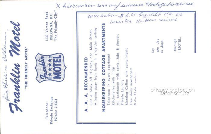 Kelowna Franklin Motel postalisch nicht gelaufen Keine Postkarte (siehe scan) Erhaltung siehe scans