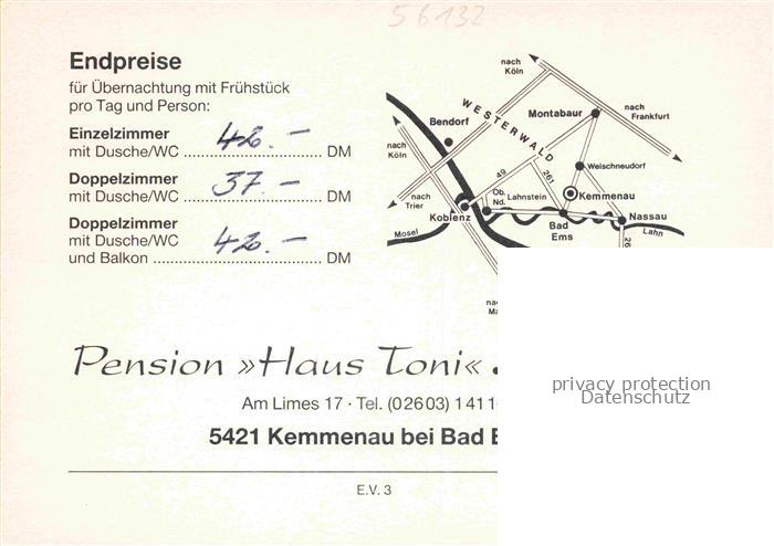 74085680 Kemmenau BAD EMS Rheinland-Pfalz Pension Haus Toni postalisch nicht gelaufen Werbekarte (keine Postkarte) Erhaltung siehe scans [WerneD78] KatCode: 11110007141071