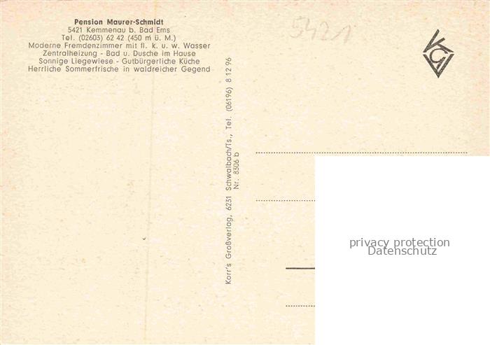 74040953 Kemmenau BAD EMS Rheinland-Pfalz Pension Maurer Schmidt Gaststube Waldweg Panorama postalisch nicht gelaufen Erhaltung siehe scans [WerneD78] KatCode: 11110007141071