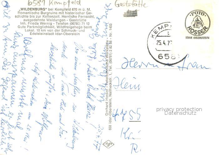 73695456 alte Postkarte Kempfeld Wildenburg Gaststaette des Hunsrueckvereins Fernsicht Landschaftspanorama postalisch gelaufen Erhaltung siehe scans [FriedD77] KatCode: 11110007134046
