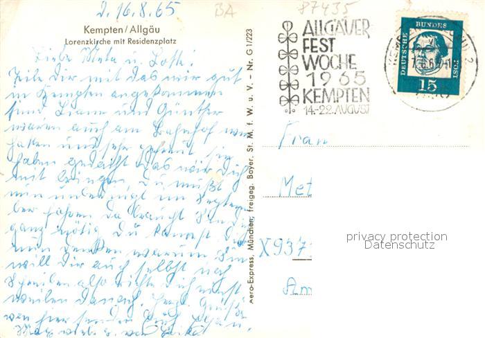 73648184 alte Postkarte Kempten Allgaeu Lorenzkirche mit Residenzplatz Fliegeraufnahme postalisch gelaufen Erhaltung siehe scans [FriedD77] KatCode: 11110009763000