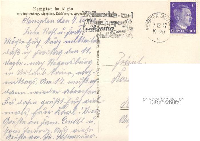 73162531 alte Postkarte Kempten Allgaeu mit Breitenberg Alpspitze Edelsberg und Aggenstein postalisch gelaufen Erhaltung siehe scans [WerneD78] KatCode: 11110009763000