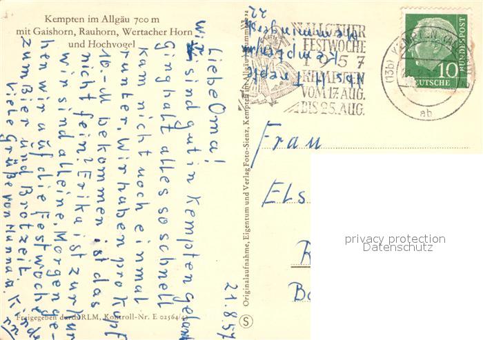 72987380 alte Postkarte Kempten Allgaeu mit Gaishorn Rauhorn Wertacher Horn postalisch gelaufen Erhaltung siehe scans [WerneD78] KatCode: 11110009763000