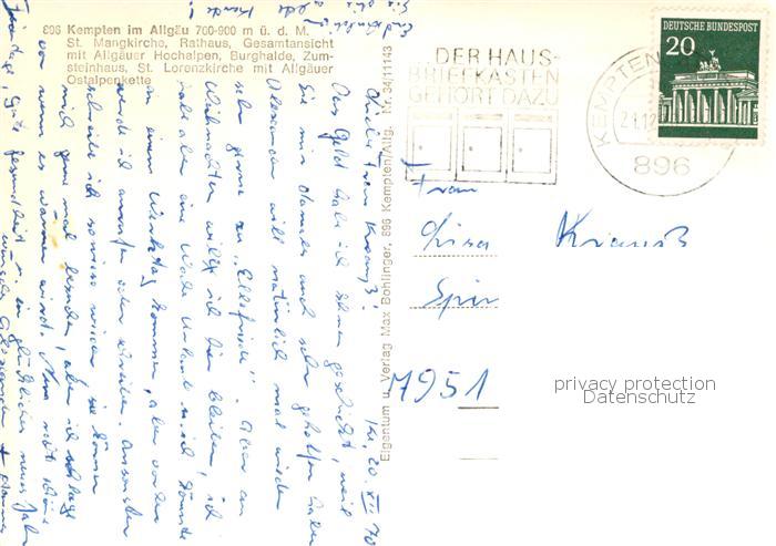 73829800 alte Postkarte Kempten Allgaeu St Mang Kirche Rathaus Burghalde Zumsteinhaus St Lorenzkirche mit Allgaeuer Alpen postalisch gelaufen Erhaltung siehe scans [WerneD78] KatCode: 11110009763000