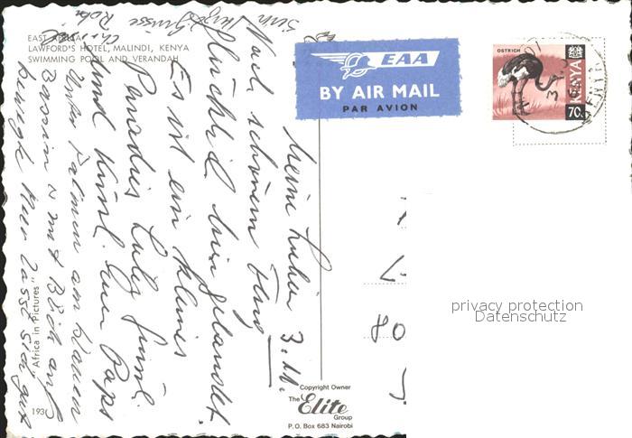 old postcard Kenia Lawford Hotel Malindi Swimmingpool Veranda postalisch gelaufen Erhaltung siehe scans