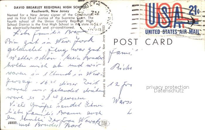 72490703 old postcard Kenilworth New Jersey David Brearley Regional High School postalisch gelaufen Erhaltung siehe scans KatCode: 14140320000000