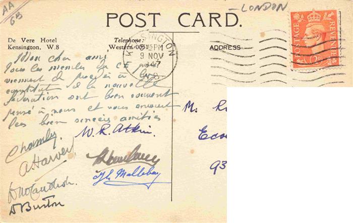 73974333 old postcard Kensington LONDON UK De Vere Hotel postalisch gelaufen Erhaltung siehe scans [WerneD78] KatCode: 11570UKI1I11AW