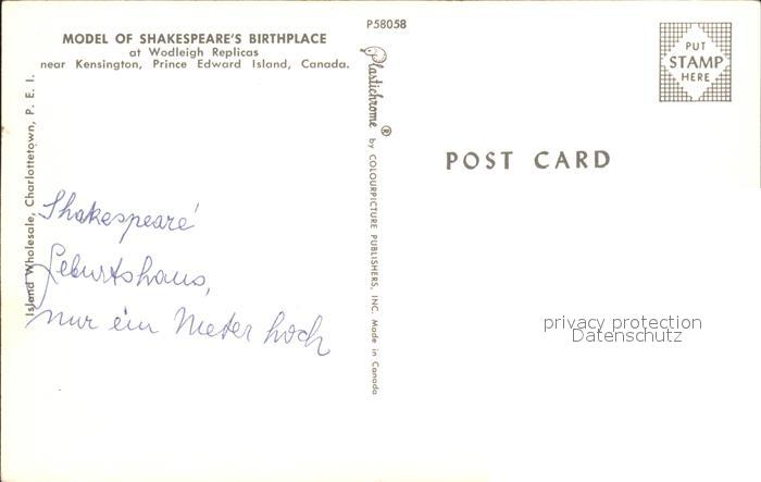 Kensington Prince Edward Island Model of Shakespeares Birthplace Wodleigh Replicas postalisch nicht gelaufen Erhaltung siehe scans