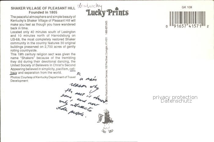 72462997 Kentucky US-State Shaker Village Pleasant Hill postalisch nicht gelaufen Erhaltung siehe scans KatCode: 14140190000000