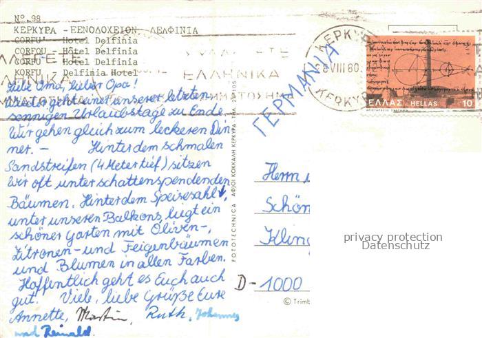 74156317 old postcard Kerkyra Hotel-Delfinia Strand Meer Badegaeste Berge Reflektion Hotelgebaeude Korfu Olivenbaeume postalisch gelaufen Erhaltung siehe scans [Karloger] KatCode: 11190
