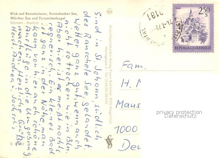 73682653 alte Postkarte Keutschach See Fliegeraufnahme mit Rauschelesee Woerthersee und Pyramidenkogel postalisch gelaufen Erhaltung siehe scans [WerneD78] KatCode: 11390211020412