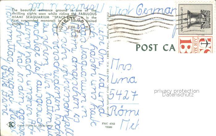 71955909 old postcard Key Biscayne Miami Seaquarium postalisch gelaufen Erhaltung siehe scans KatCode: 14140110000000