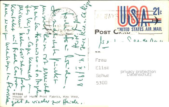 72486808 old postcard Key West House of Hand Print Fabrics postalisch gelaufen Erhaltung siehe scans KatCode: 14140110000000