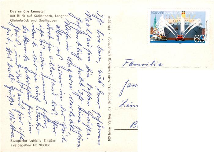 73942325 alte Postkarte Kickenbach Altenhundem Fliegeraufnahme mit Blick auf Langenei Gleierbrueck und Saalhausen postalisch gelaufen Erhaltung siehe scans [FriedD77] KatCode: 11110005966020