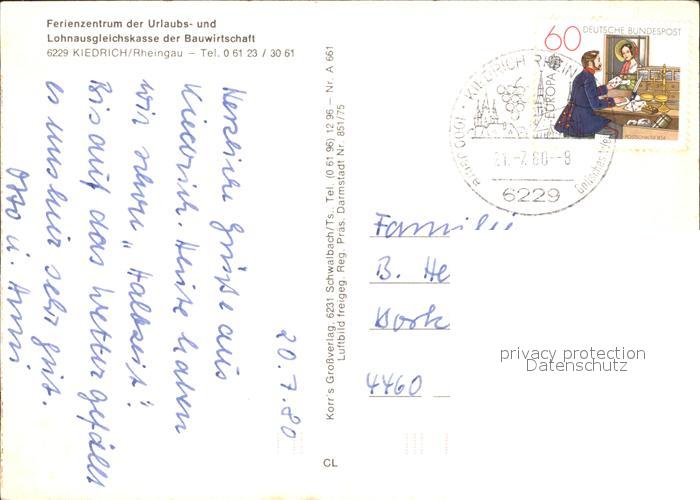 72247399 alte Postkarte Kiedrich Fliegeraufnahme Ferienzentrum der Lohnausgleichskasse Bauwirtschaft postalisch gelaufen Erhaltung siehe scans KatCode: 11110006439009