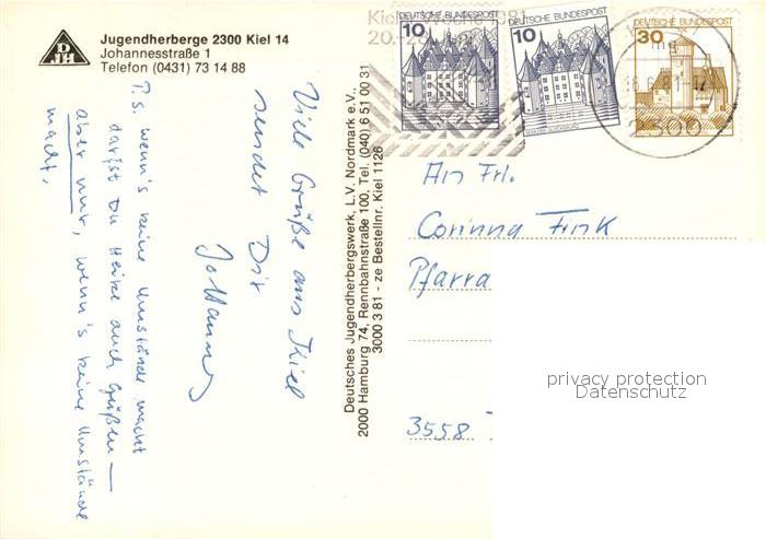 73166771 alte Postkarte Kiel Jugendherberge Kirche Fussgaengerzone postalisch gelaufen Erhaltung siehe scans [KathaD81] KatCode: 11110001002000