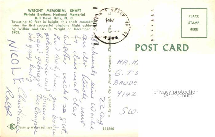 72735220 old postcard Kill Devil Hills Wright Memorial Shaft National Memorial postalisch gelaufen Erhaltung siehe scans [FriedD77] KatCode: 14140350000000