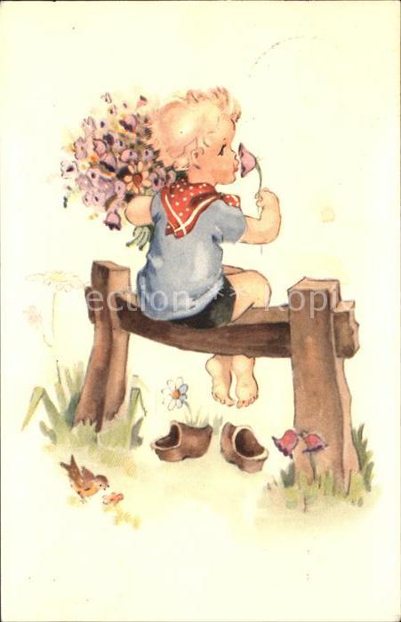alte Postkarte Kinder Child Enfants Blumen Vogel Holzschuhe postalisch gelaufen Erhaltung siehe scans