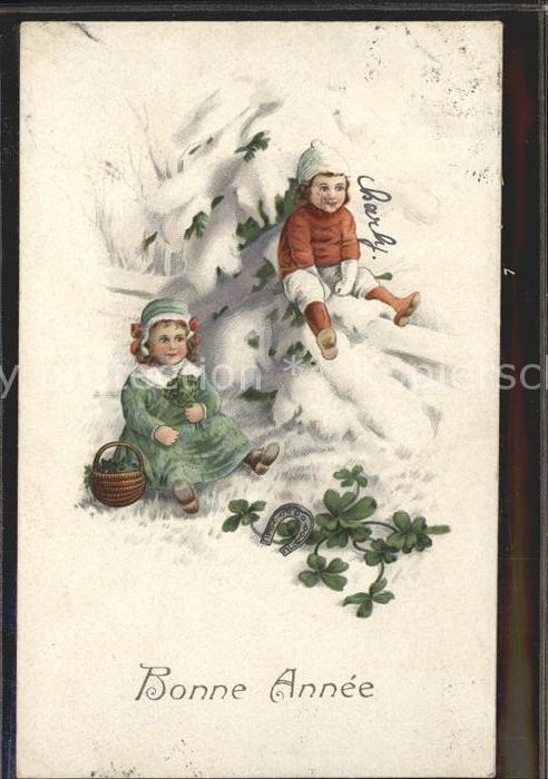 alte Postkarte Kinder Child Enfants Neujahr Kleeblaetter Hufeisen postalisch gelaufen Erhaltung siehe scans